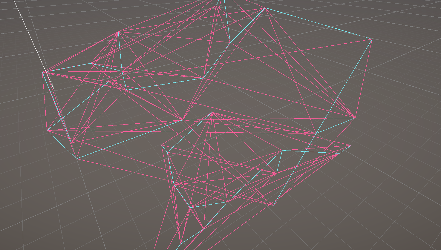 | Prim's Algorithm | Once the space is triangulated, Prim's Algorithm is used to find the shortest path between every point. We are left with a minimum spanning tree that contains no cycles; a basis for the rooms to be connected together contiguously. |