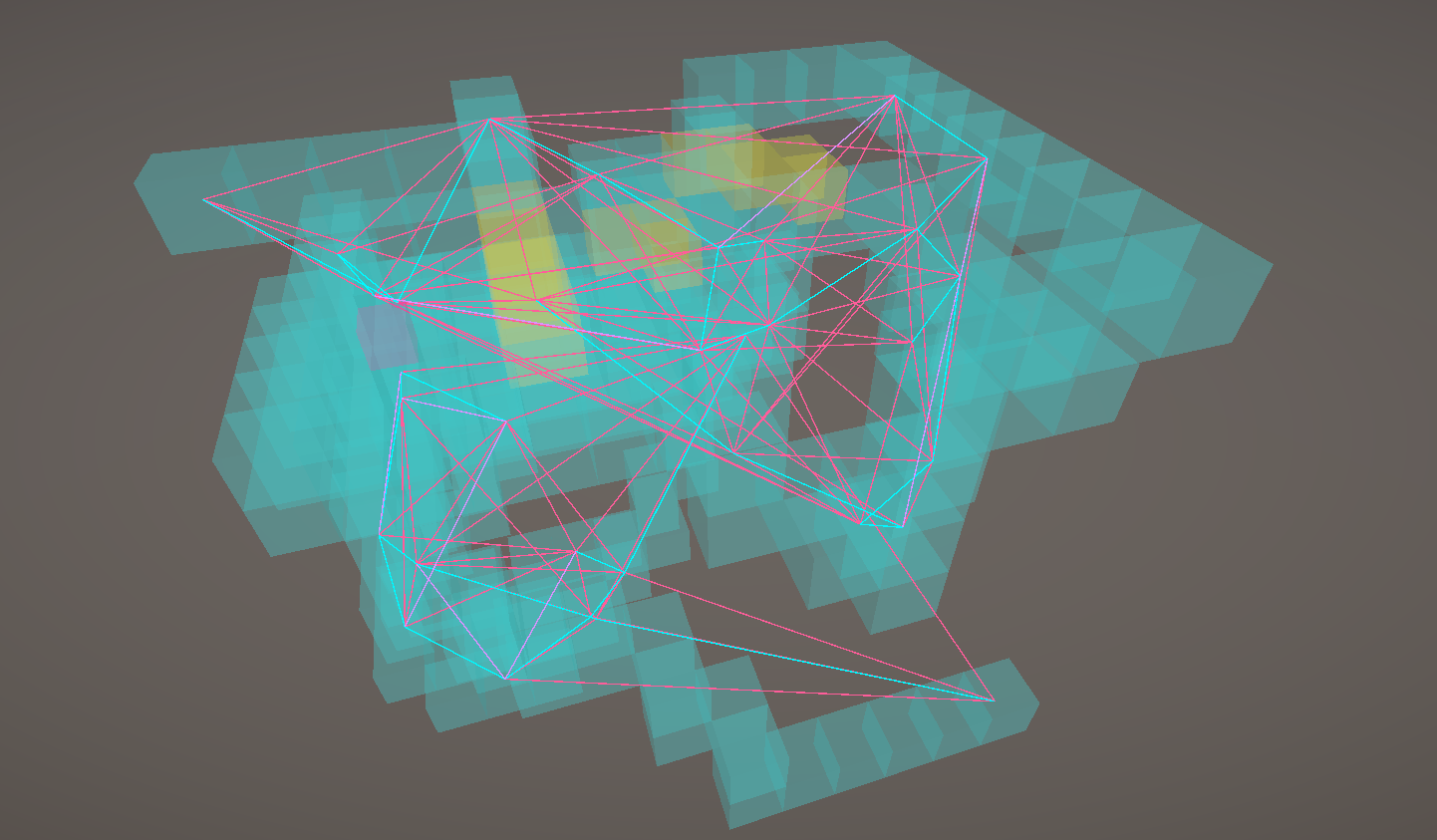 | Delaunay Triangulation in 3D | In two dimensions Delaunay Triangulation is a set of points and triangles that divides a plane into a Voronoi diagram where the triangle's angles are maximized. In three dimensions the plane is now a rectangular prism and the triangles are now tetrahedra. This subdivision algorithm is used commonly in the graphics space for surface rendering but here it is the perfect application for making paths in the dungeon. |
